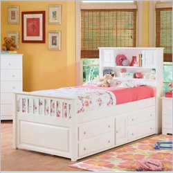 Atlantic Furniture - Beds - 85 - The Captain's Bookcase Storage Bed offers an under bed 4 drawer storage chest. The head board Features shelves and two cabinets. The under bed storage chest Features four drawers with cabinet. White finish Exhibits a sweet and playful Country style Features solid hardwood construction with quality wood veneers Headboard book shelving and 2 utility cabinets Under bed four drawer chest Slatted detail footboard Mattresses not included Specifications: Under Bed Storage Chest: 18W x 18.25H x 75D