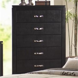 Coaster - Chests - 201405 - This cool contemporary chest of drawers will add a unique style and great storage to your master bedroom The piece has a sleek shape, with clean lines The top is wood veneer so you can decorate with accent pieces, while the case sides and front are covered in rich black faux leather There are five spacious drawers to meet all of your storage needs, with plenty of room for clothing and other essentials Shiny silver handles add a modern touch to this gorgeous chest Add this piece to your bedroom for a calming space where you can truly relaxBlack finishConstructed of wood veneers and solids, with faux leather case sides and veneered topsContemporary styleFive Spacious DrawersDovetail constructionCenter drawer glidesClean straight lines, smooth edges, tapered feetShiny silver drawer handlesSpecifications:Overall dimensions: 48H x 33W x 15.75D inchesWeight: 107.80 lbs.
