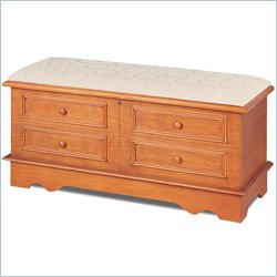 Coaster - Chests - 4674 - Cedar chests are known for the enhanced storage capabilities and whimsical charm they bring into your home and this collection of storage chests is no exception. A variety of shapes, sizes and even finishes ensures you'll find a cedar chest that's just your style, from traditional cherry finish chests with locking lids to pine chests with painted details that up the charm factor of any space. Simple tops double as additional seating options and lift open to reveal roomy interiors that easily accommodate blankets, bed linens and bulkier clothing items. Place in the hallway or laundry room for convenient coat and shoe storage, tuck in a corner for out of sight storage or set at the foot of the bed to keep extra linens and everyday items close at hand. Framed false drawer fronts dress up the face of this padded pine cedar chest for a classic style that doesn't sacrifice interior storage space. Its pine exterior pairs beautifully with casual and cottage styles of decor, while a plushly padded top makes this cedar chest a welcome addition to high traffic spaces like hallways, entryways and laundry rooms. Round wooden knobs, a light golden finish and a carved apron with bracket feet round out this padded top storage chest's casual yet classic appeal. Light golden finish Padded pine cedar chest Carved apron Bracket feet Round wooden knobs Framed false drawer fronts Specifications: Overall dimensions: 48 W x 18 D x 22 H Weight: 81.84 lbs.