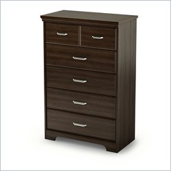 South Shore - Chests - 3179035 - The Versa 5 drawer chest has an understated urban chic. Spare lines combined with definitive decorative detail create a highly adaptable country look. Metal pulls are enhanced by an antiqued finish with brass color highlights for an enduring appeal you will enjoy for many years. Chest in Moka finish Made of laminated particle board Five practical storage drawers Made of EPP certified panels (Environmentally Preferred Product) Packaging is ISTA 3A-certified to ensure its integrity and your total satisfaction Shrink-wrapped packaging with reinforced corners to reduce the risk of shipping damage Metal pulls have an antique pewter color finish Top drawers on the dresser are bluff cut for a multiple drawer look Decorative kickplate Smart Glide drawer slides with stops and built-in dampers Country style Ready to assemble 5-year warranty Made in Canada Specifications: Overall Dimensions: 47.56 H x 31.5 W x 16.43 D Drawer Interior Dimensions: 27 W x 14.25 D Weight: 86 lbs Shipping Ca rton Dimensions: 9 H x 19.75 W x 51.75 D