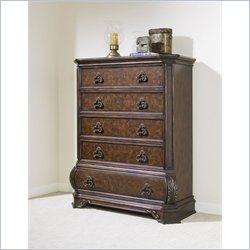 Pulaski - Chests - 962124 - The new European inspired Pulaski Wellington Collection immerses itself in old world elegance and grandeur that will add style and glamour to any home. Foliated overlays, bombe shaped bottoms and high arched beds add magnificence to this collection.Made of select solids and White Ash burl with Birch veneersDark Rich Cherry finish with Gold highlightsFive individually framed drawersFelt bottom in top drawerDust proofing between drawersWooden drawer guidesAntique brass finished hardwareTraditional European styleSpecifications:Overall Dimensions: 60 H x 48 W x 21 DWeight: 170 lbs